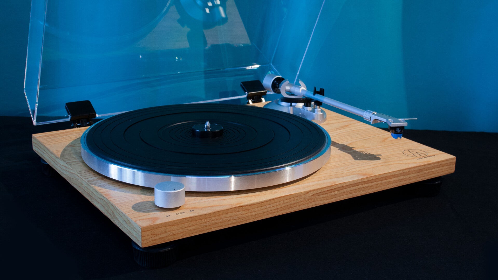 - Fonctionnement manuel à entraînement par courroie, avec deux vitesses : 33 1/3 et 45 tr/min