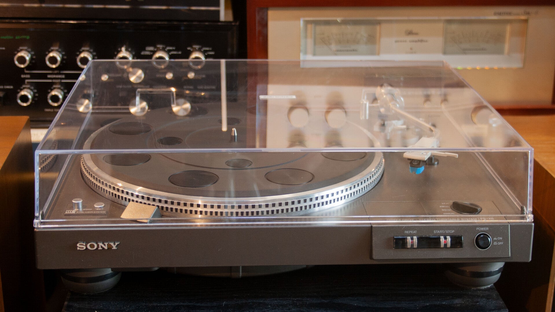 Un lecteur entièrement automatique équipé d'un moteur sans fente et d'un système de verrouillage à quartz. Il adopte un système d'entraînement direct, grâce auquel un moteur entraîne directement la platine. Ce moteur est équipé d'un nouveau moteur linéaire sans fente. En principe, le moteur Cono utilise un système d'entraînement linéaire avec très peu de variations de couple, assurant ainsi une rotation fluide et silencieuse. De plus, un couple élevé peut être obtenu efficacement grâce à une bobine à noyau d'air équilibrée et à un anneau magnétique.